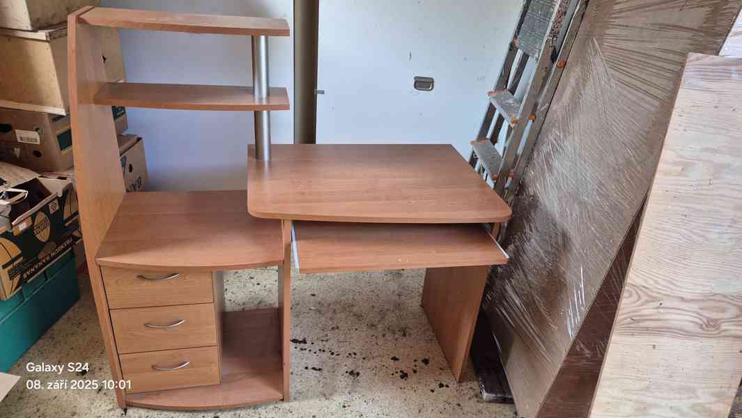 Zachovalý stolek pod počítač se zásuvkami, výsuvnou pracovní deskou