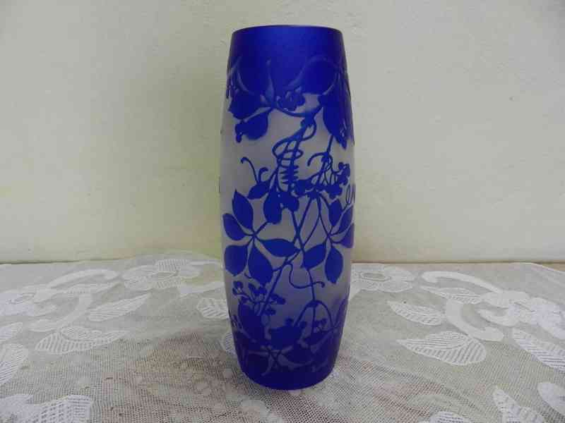 Luxusní přejímaná modrá Váza, leptané vrstvené sklo - Harrachov nebo Nový Bor, 1 pol. 20 stol.