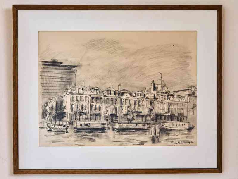Kresba uhlem zachycující městské nábřeží s historickými domy a kotvícími loděmi, signováno Engelman 1980. Dílo je provedeno energickým moderním rukopisem s důrazem na atmosféru městského prostředí. Uhel vytváří jemné přechody i výrazné kontrasty, které dodávají kresbě hloubku a živost. Kresba je adjustována v kvalitním dřevěném rámu s paspartou. Na zadní straně se nachází originální štítek Kunsthandel Engelchor, Zeilstraat 19 Amsterdam, což potvrzuje původ z renomovaného nizozemského obchodu s uměním. Celkový stav je velmi dobrý, papír bez poškození, rám ve výborném stavu. Technika uhel na papíře. Datace 1980. Signatura Engelman 1980 v pravém dolním rohu. Původ Amsterdam. Rámováno a připraveno k vystavení. Vhodné pro sběratele evropské kresby i jako stylový doplněk interiéru.