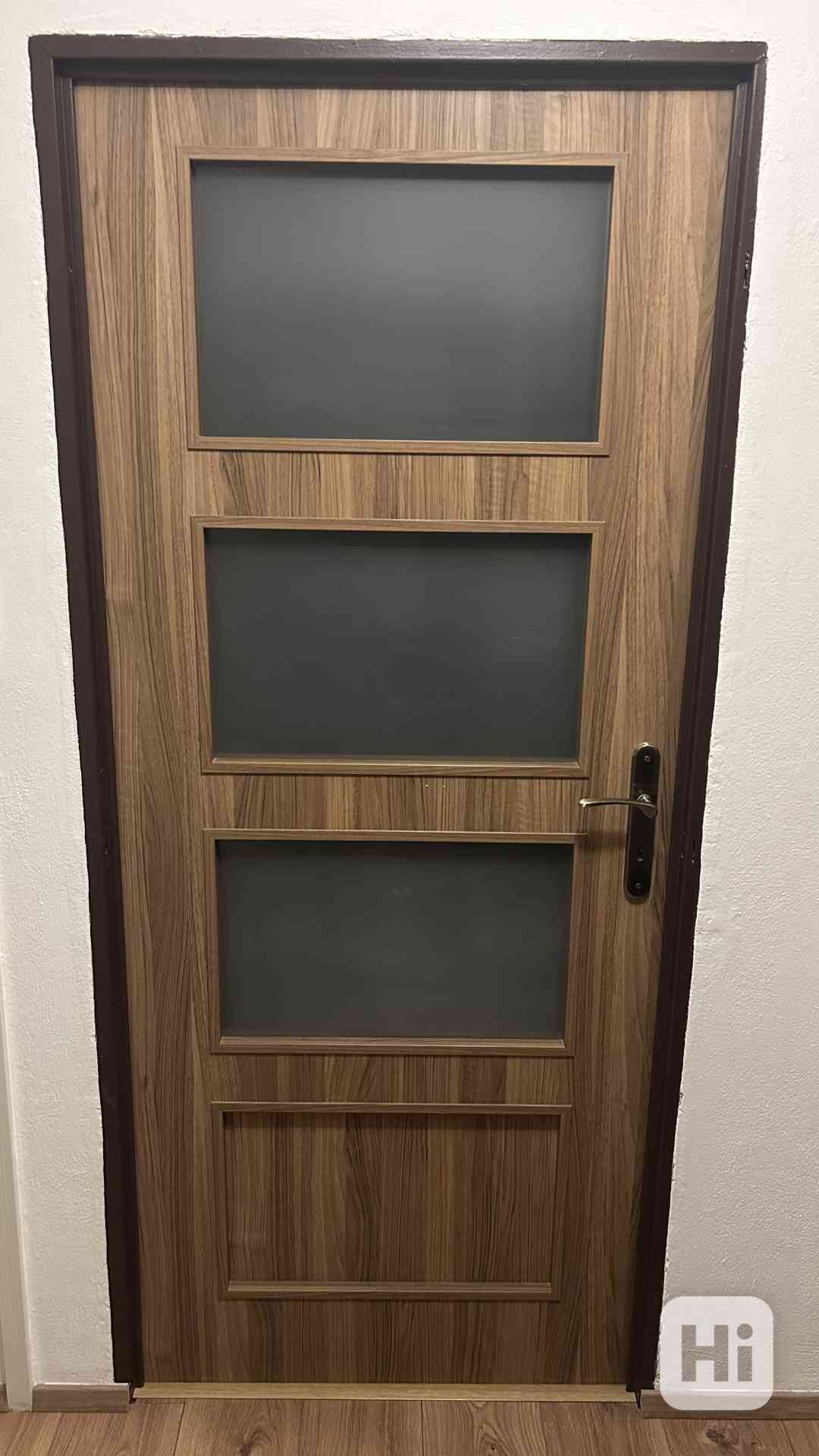 Prodám 2x pravé interiérové dveře v dekoru ořech s mléčným prosklením včetně kování v barvě bronzu.