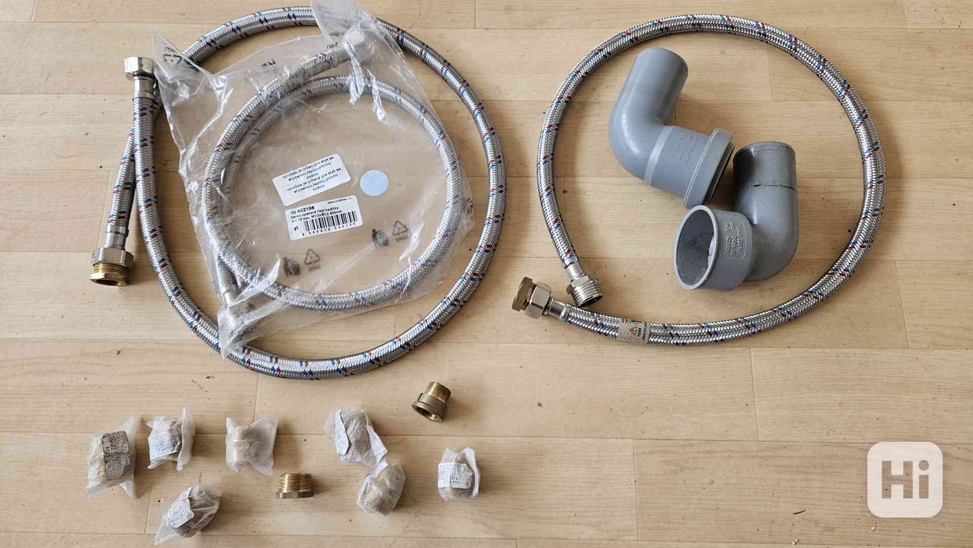Nerez opletená flexi hadička 3x, plus mosazné koncovky, plus dvě plastová odpadni kolena, cena za vše dohromady, Kralupy.