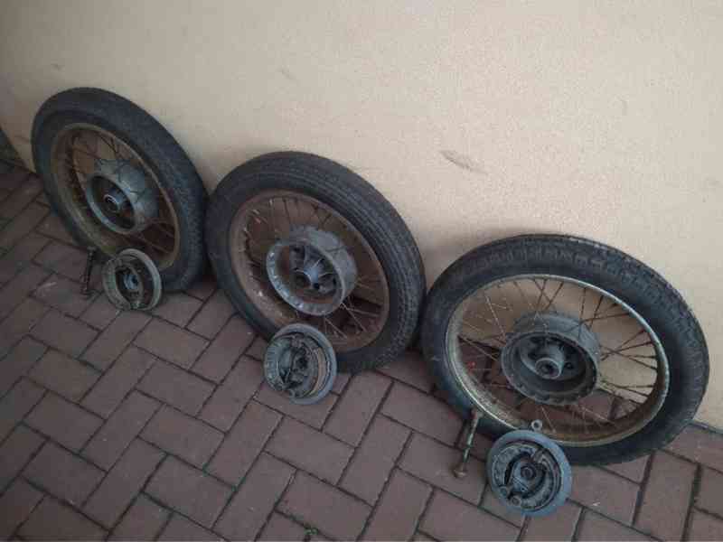 Prodám na motocykl JAWA (kývačka,panelka aj.) v původním stavu 3 ks kompletních 16“ kol :originál ráfky,ložiska,prachovky a kompletní brzdový segment (tento ve velmi dobrém stavu) ,včetně velice dobrého brzdového obložení obložení.Součástí i 2x originál upínací šroub kola s podložkami a matkou.Kola samozřejmě včetně pneumatik a to:1x Barum 3,25x16 dále 1x Barum 3,5x16 a 1x Decum (Madein poland) 3,00x16.Ráfka koroze (ponecháno v původním stavu bez zásahu)