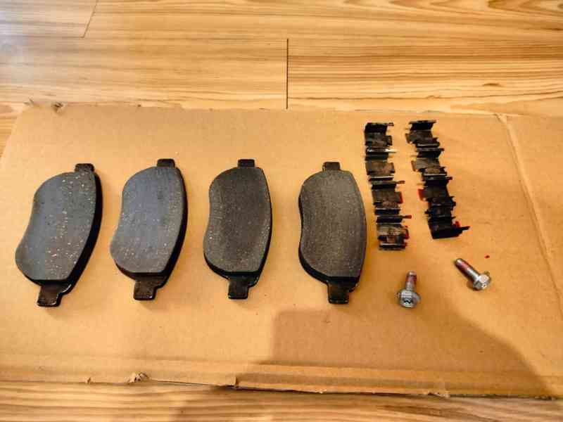 Brzdový segment destiček ještě min.75-80%.(Původní celková síla nové nepoužité destičky:19 mm).Aktuálně tyto použité destičky celková síla v rozmezí:16,2-16,6 mm-viz foto.Destičky v pořádku a včetně příslušenství-viz foto a to 8 ks vodících plechů (použitý s destičkami ale taktéž v naprostém pořádku) + 2 ks zcela nových šroubů.