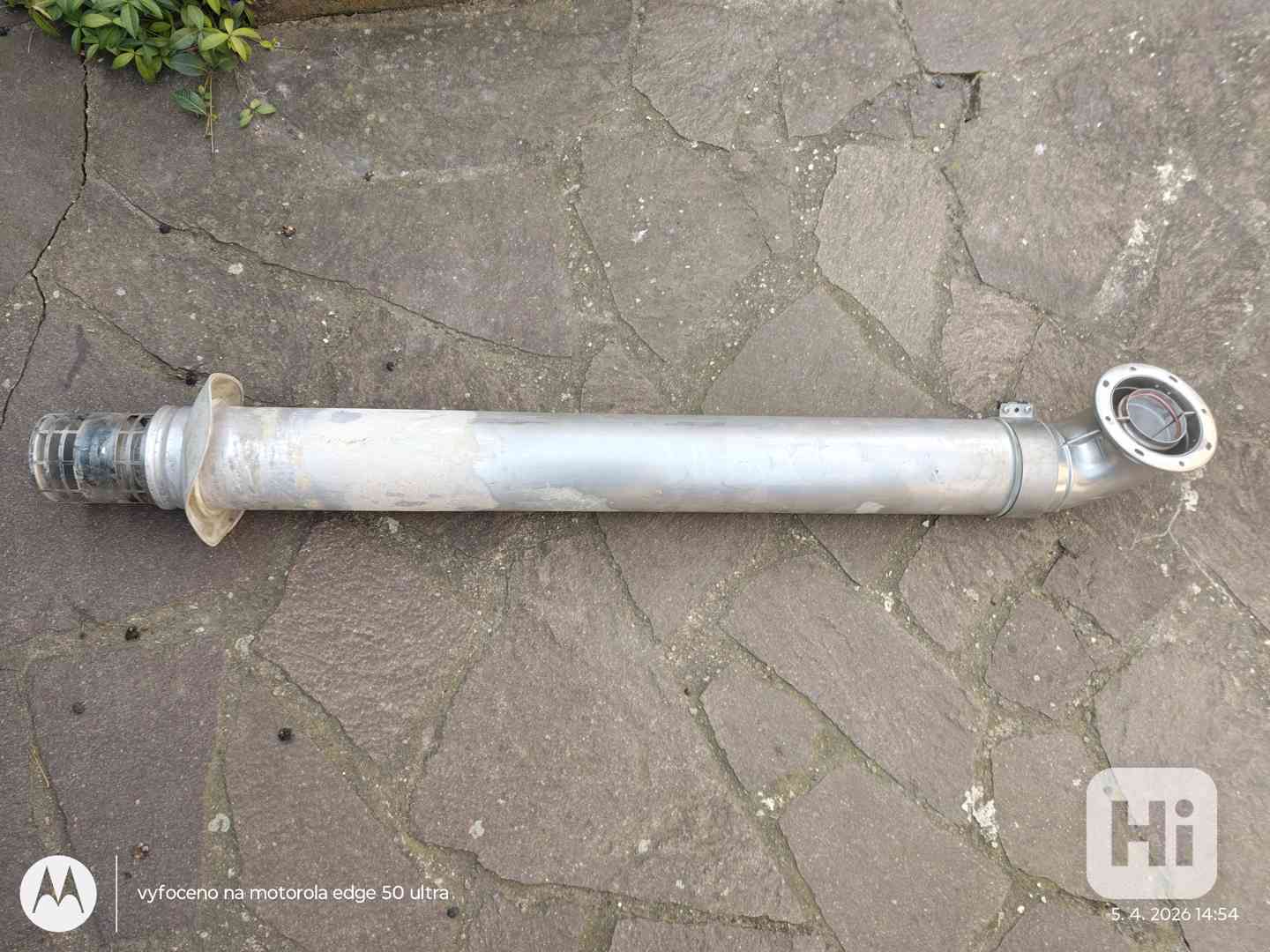 Funkční horizontální odkouření přes zeď pro plynové turbo kotle. Délka 110 cm, průměry 100/60. Brandýs nad Labem.