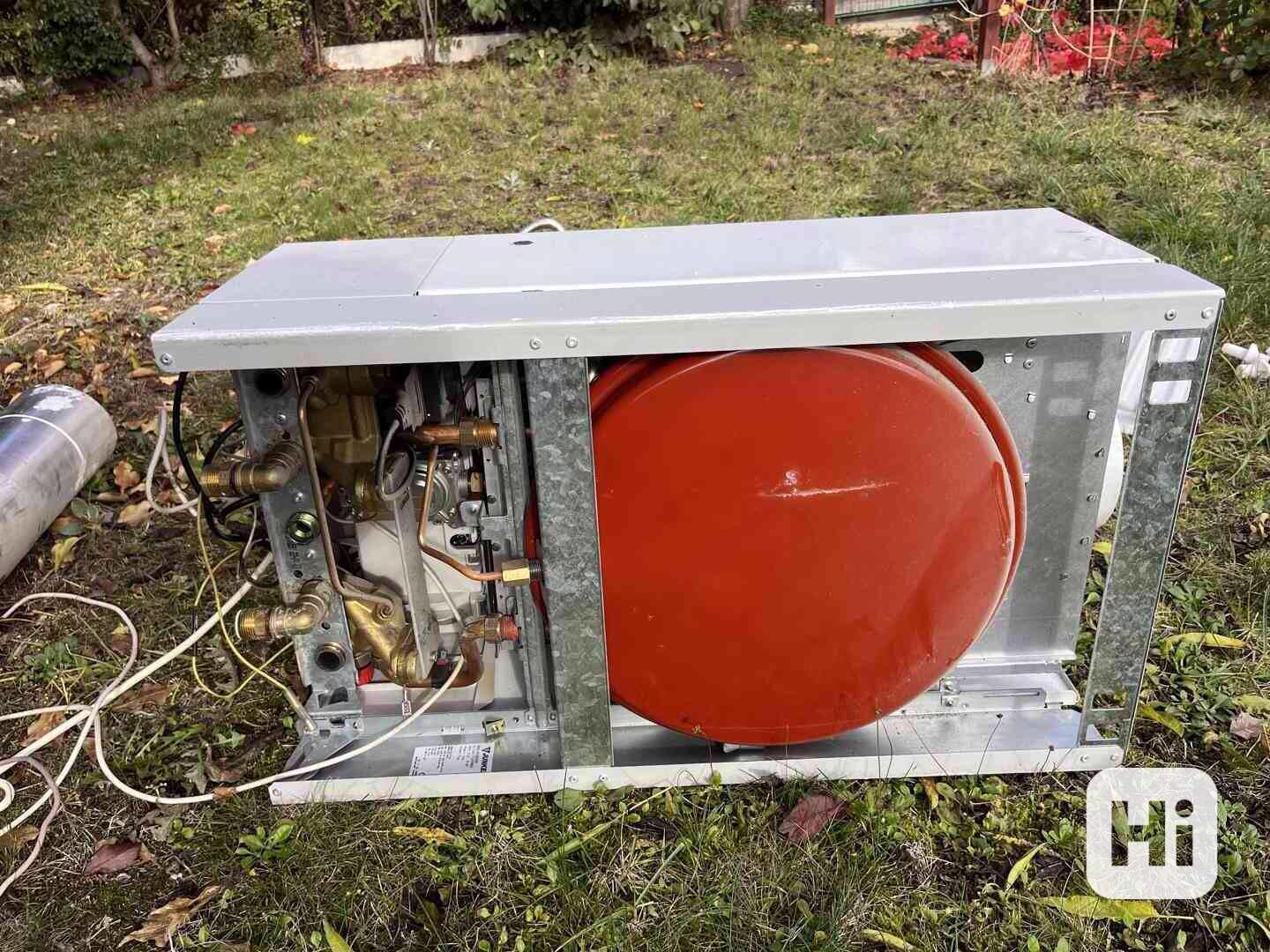 Kombinovaný závěsný plynový kotel Junkers Novastar ZW 23-1AE (turbo přes zeď) s měděným šnekovým výměníkem. Zánovní, funguje, žádné součástky mu nechybí, před pár lety měněna nová ovládací deska, v níž je umístěna řídicí elektronika. Za neporušeným bílým kovovým krytem je kompaktní hydroblok, jehož součástí je deskový výměník, čerpadlo s odvzdušněním, trojcestný ventil, snímač průtoku, dopouštěcí ventil, pojistný 3 bar ventil a čidlo NTC výstupu teplé vody. Dolní plastová část krytu porušena, chybí okénko tlaku.