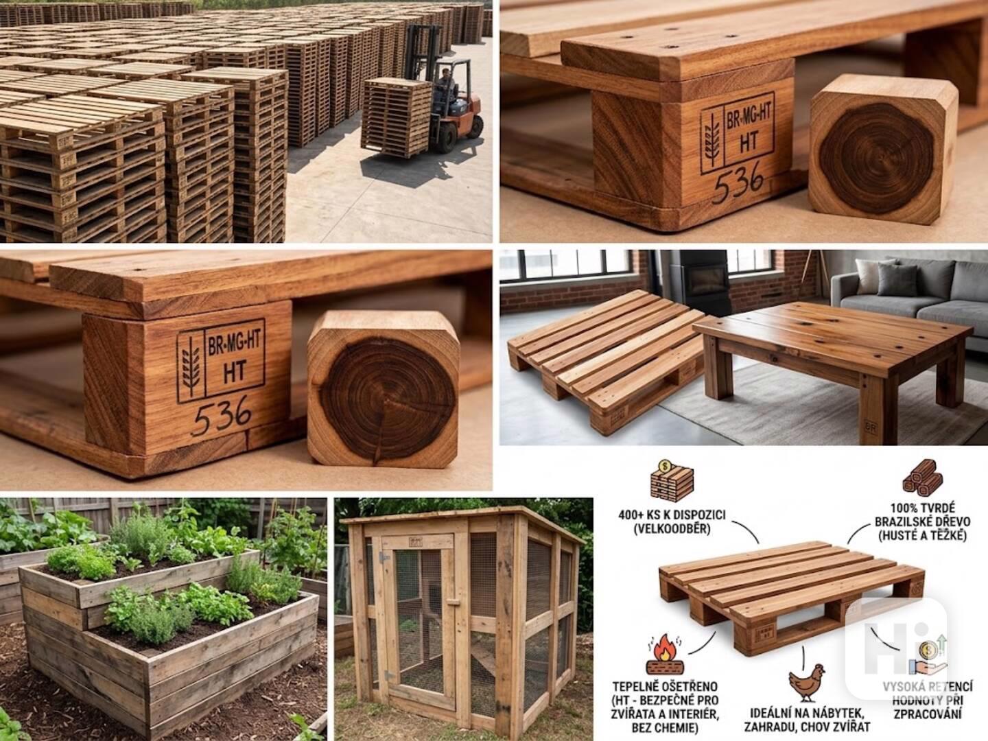 "Prodám bytelné brazilské palety z tvrdého dřeva (exotika/eukalyptus). Jsou velmi těžké a masivní, vhodné na výrobu zahradního nábytku, ponků nebo designových doplňků. Označení HT (bez chemie, pouze tepelně ošetřeno.