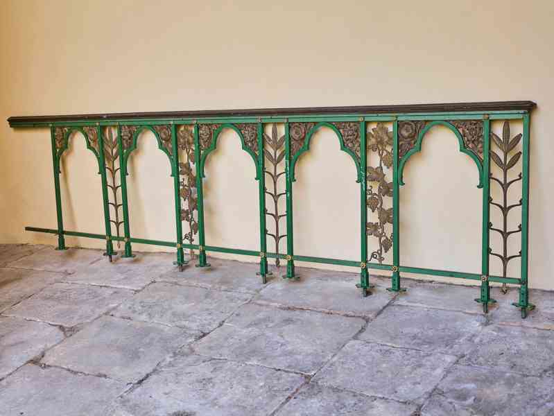 Masivní dekorativní zábradlí s bohatým motivem vinné révy, listů a hroznů, provedené v kombinaci těžkého bronzu a litiny. Jednotlivé panely jsou rámovány obloukovými gotizujícími prvky a doplněny plastickými florálními detaily v bronzové patině. Zábradlí působí velmi reprezentativně a výrazně, vhodné pro historické interiéry, vstupní haly, zimní zahrady či jako dekorativní prvek na terasu nebo galerii.