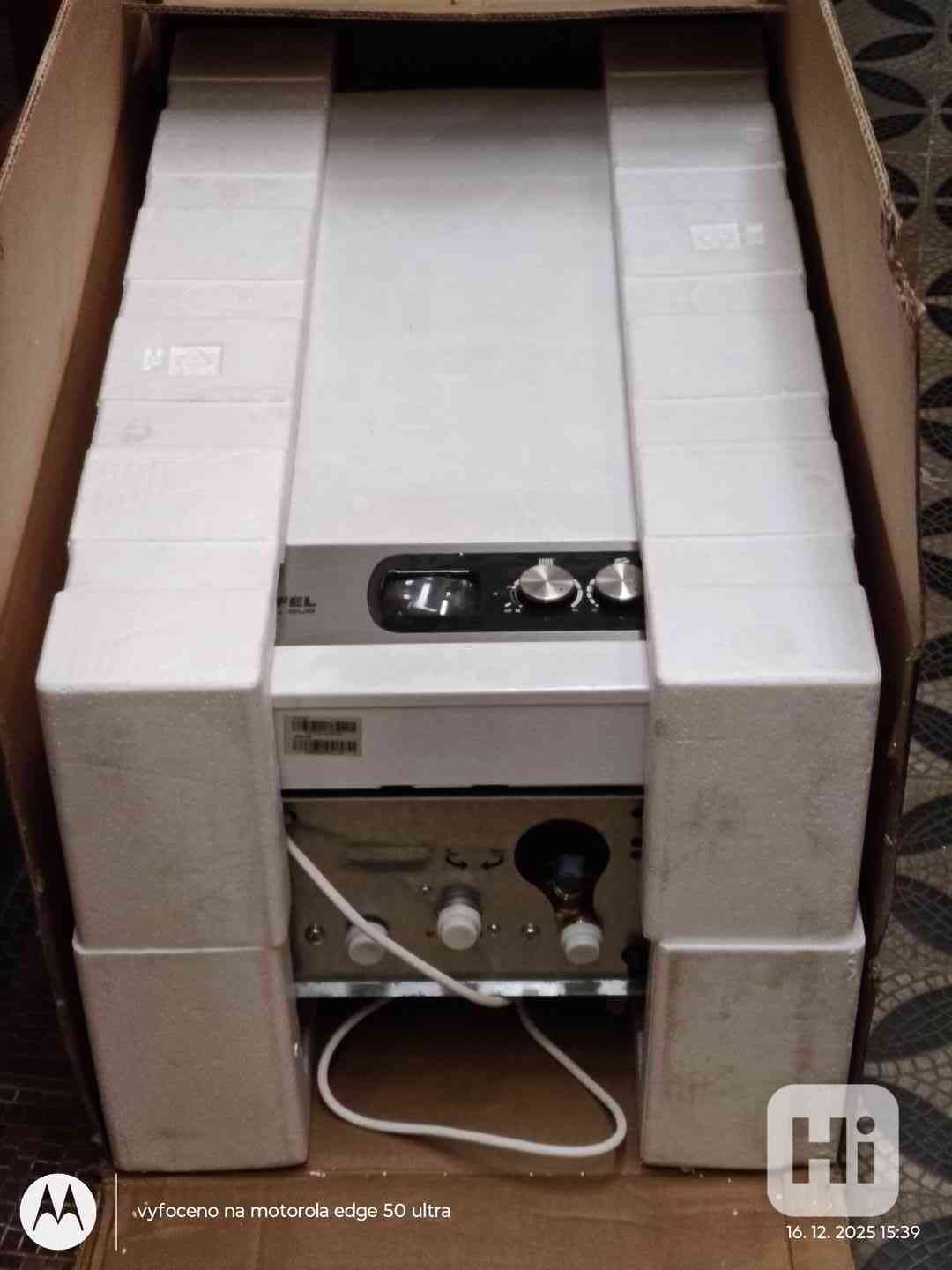 Nový plynový kombinovaný (tj. pro vytápění i průtokový ohřev teplé vody) turbo kotel Airfel –Daikin Digifel Duo 24 KW KM1-24CE. Nastavitelný rozsah výkonu 10,5 – 25,7 kW, rozměry 730x435x330. Kompletní dokumentace, doklad o koupi, podrobný český instalační a provozní návod. Dvojitý výměníkový systém (nerez, Cu) . Kompatibilita se zemním plynem a LPG. Provoz řízen s 3 rychlostním čerpadlem s nízkou spotřebou Grunfos. Možnost integrovaného provozu s venkovním čidlem. Zakoupen v roce 2016 jako budoucí náhrada za současný kotel a uskladněn ve vytápěné suché místnosti. Již nevyužitý. Zájemcům předám kontakt na instalaci a servis. Také nabízím několik nových dílů odkouření pro turbokotle celkem za 450 Kč. Na finty s platbou kurýrem nereaguji. Brandýs nad Labem.
